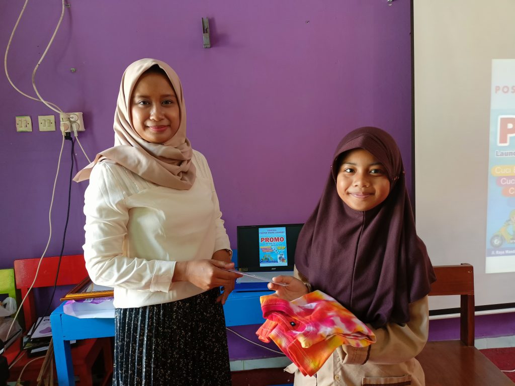 Sesi pertama menghadirkan narasumber inspiratif yang mengenalkan siswa pada dunia usaha mikro, khususnya usaha laundry. Dalam sesi ini, siswa diajak memahami bagaimana sebuah jasa seperti laundry bisa dijalankan, dipromosikan, dan memiliki nilai ekonomi. Melalui kegiatan membuat poster promosi usaha laundry, siswa belajar menyusun kalimat ajakan, memilih gambar menarik, dan menyampaikan pesan dengan bahasa yang sederhana namun efektif. Aktivitas ini juga melatih kreativitas, berpikir kritis, dan keterampilan visual anak.